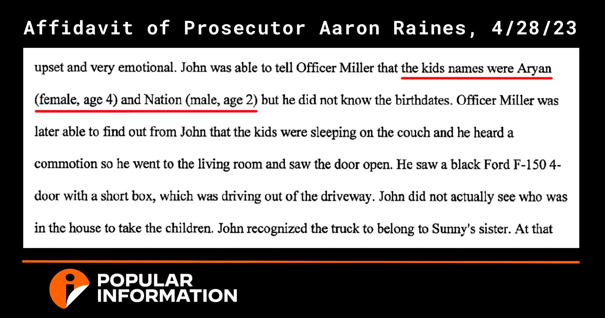 According to criminal records obtained by Popular Information, on April 7 at 1:15 AM, shortly after being released from jail, White requested a "civil escort" to retrieve her children from their father's house. White said the father of the two children, John Holmes, was "not a fit parent." She told the police, "she was afraid to go to John's house without a civil standby and… the children were afraid of John."