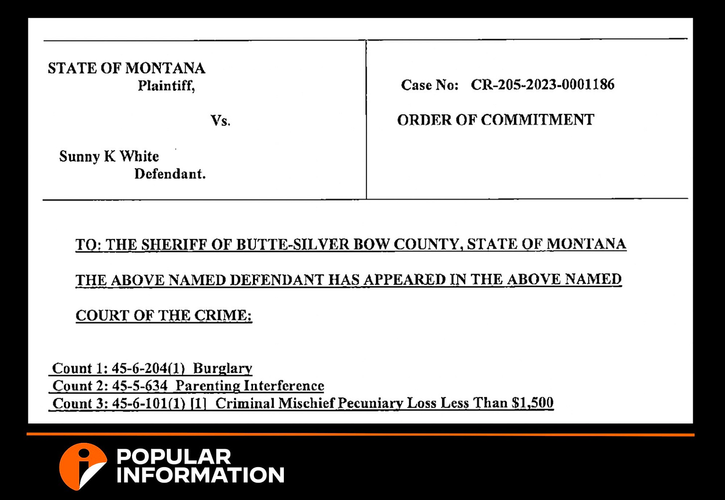 According to court records, 28-year-old Sunny White was behind the wheel of the Escalade, and her two young children were in the backseat. White was charged that day in the Lake County Justice Court with two counts of criminal child endangerment, the court clerk told Popular Information. But on April 6, Lake County Attorney James Lapotka dropped the charges, and White was released. The charges were dropped "without prejudice," which means they could be refiled.