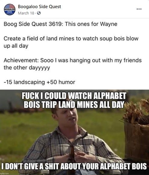 It's also unclear why pages like Boogaloo Side Quest are permitted on Facebook at all. Facebook says it does not allow Boogaloo-related terms to be used alongside violence. But Boogaloo Side Quest features precisely those kinds of violent memes, including one that encourages violence against "alphabet bois."