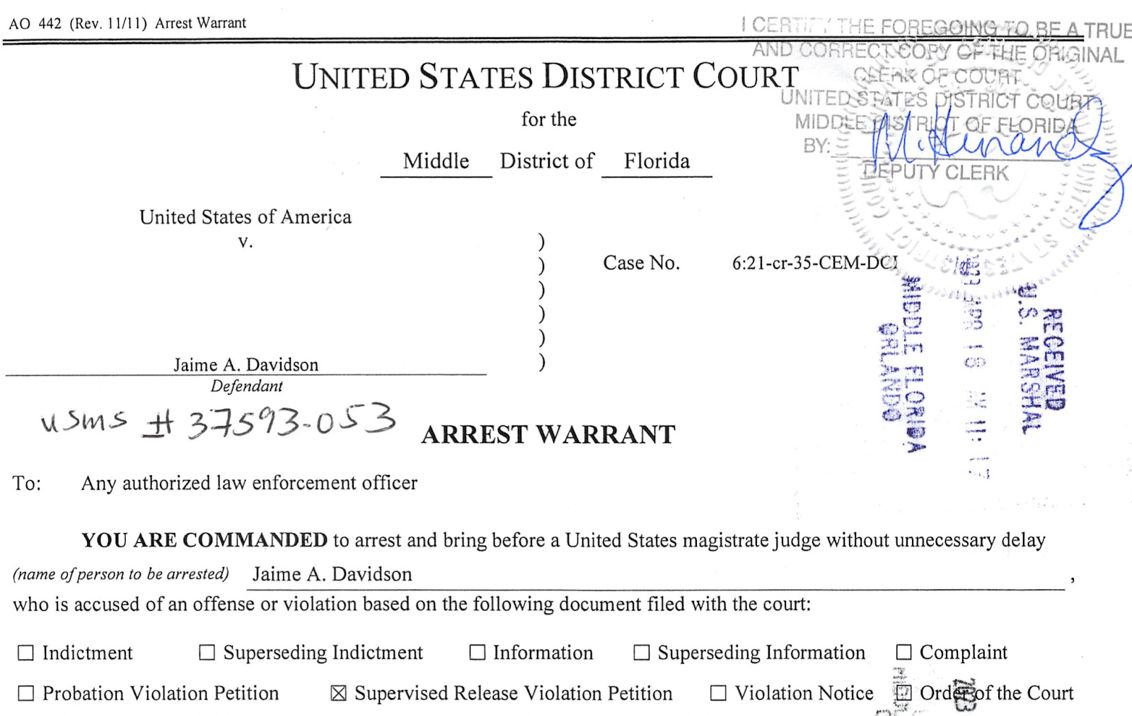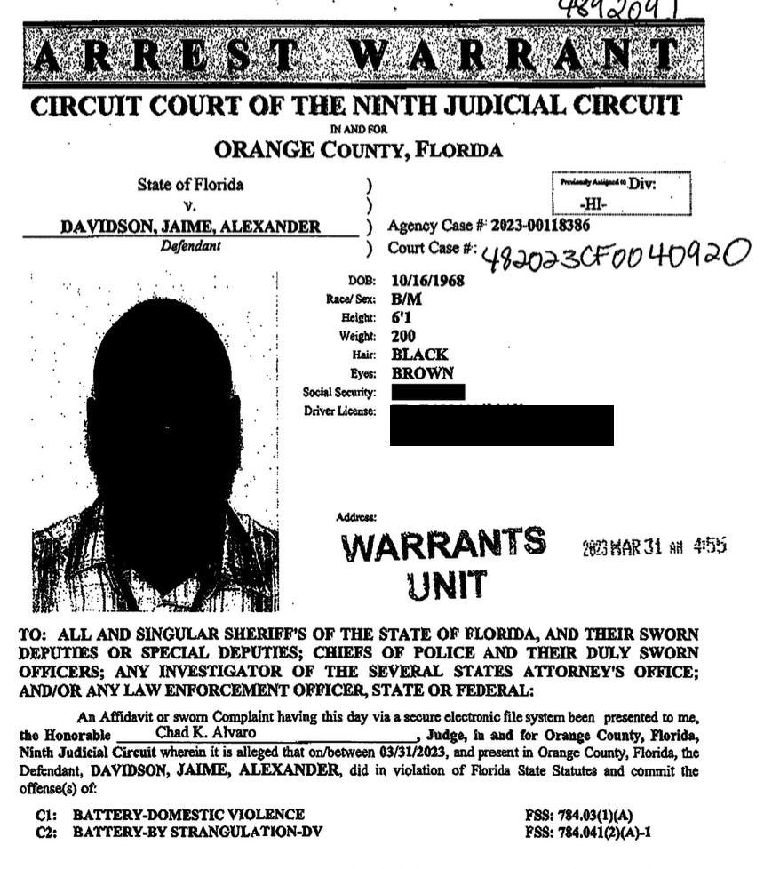 On March 31, 2023, a little more than two years after Davidson was set free by Trump, Davidson was arrested in Orlando, Florida, and charged with battery by strangulation and domestic violence. Davidson was accused of attacking Nayeli Chang, his wife of five months.