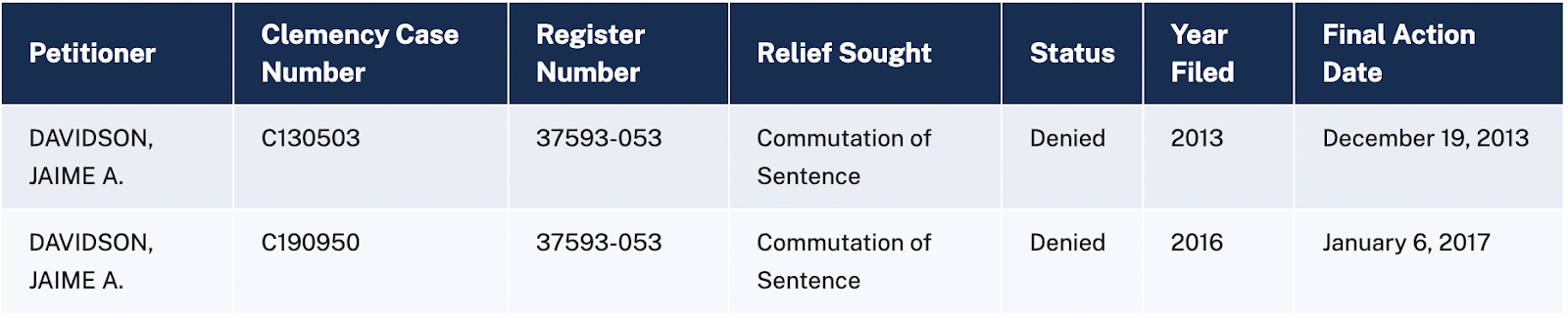 The prosecutor in Davidson's 1990 conviction, John Duncan, was never contacted and was dumbfounded by the decision. "If you ask me for a list of people who nobody should give a presidential commutation to,” Duncan told the New York Times in 2021, “Davidson would pretty much be at the top of the list.”