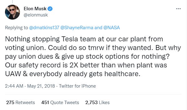 Musk, however, has sought to aggressively discourage unionization at Tesla. In a 2018 tweet, Musk threatened to rescind employee stock options at Tesla if workers decided to join a union.