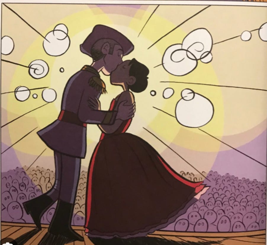 Burkhardt cited her story as a reason to restrict access to Drama, a novel published by Scholastic. The book includes this image of two people kissing: