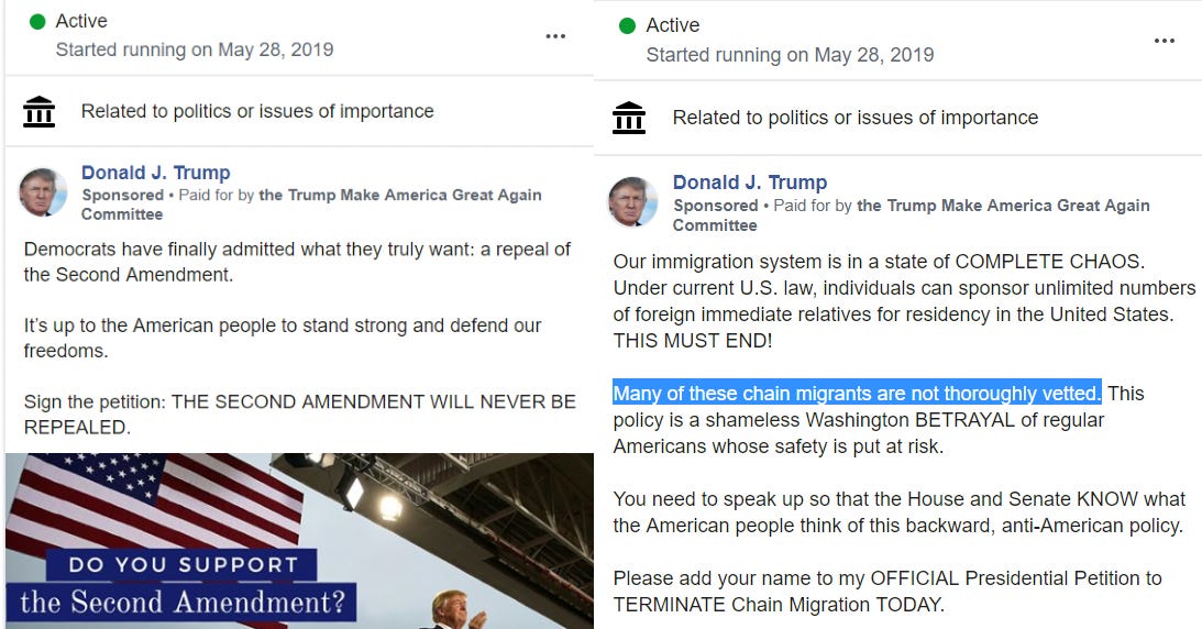 But Trump hasn't stopped using Facebook ads to mislead the public on hot button issues. Today he is running ads that claim Democrats want to repeal the Second Amendment (they aren't) and relatives of immigrants aren't thoroughly vetted before entering the country (they are).