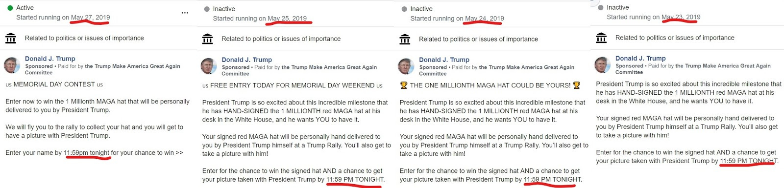 The Trump campaign, however, also ran ads about the MAGA hat contest with a midnight deadline on May 27, 25, 24, and 23. It is a false deadline designed to mislead Trump supporters by a fabricated sense of urgency.