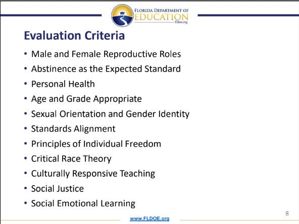 The Florida Department of Education hired unnamed "experts" to review each proposed sex education curriculum. These experts were then required to evaluate all materials on 11 separate criteria, some of which were inscrutable. (Experts were paid $330 for each completed review.)