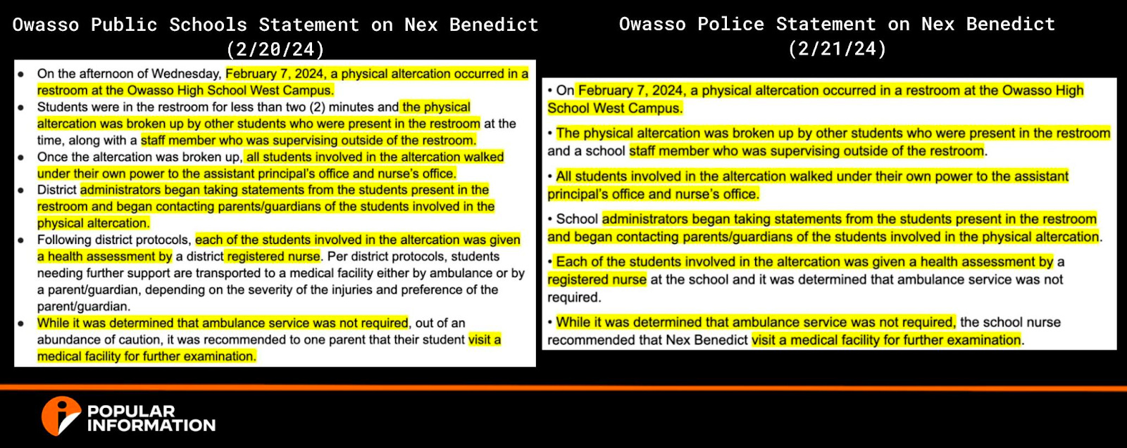 There are several aspects of the Owasso Police statement that raise serious questions. The statement paints the school's response, which is part of the investigation, in a favorable light. But large sections of the Owasso Police's February 21 statement were copied verbatim from a statement released by Owasso Public Schools on February 20.