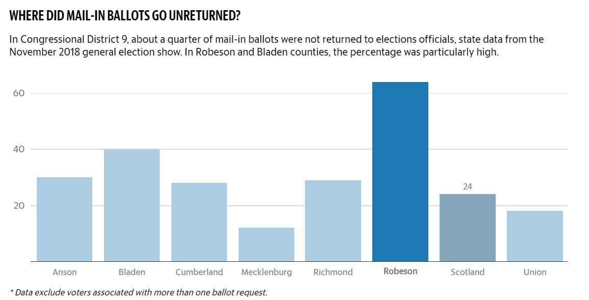 In Bladen County, the breakdown for African Americans and American Indians generally reflected the district-wide figures. But in Robeson County, 75 percent of the mail-in ballots requested by African Americans and 69 percent of the mail-in ballots requested by American Indians were listed as unreturned.