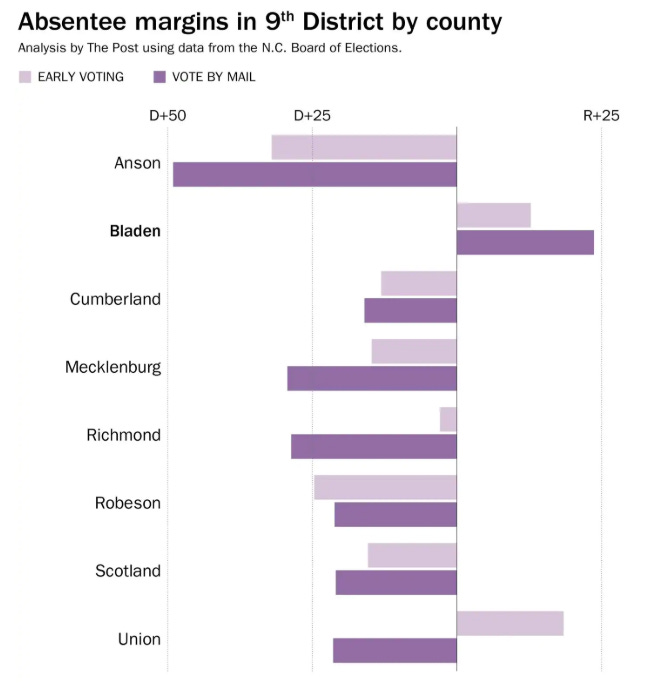 It was the only county where Harris won the absentee vote. The Washington Post notes in "every other county, mail-in absentee ballots favored McCready, the Democrat, by at least 16 points. In Bladen, Harris won by 24 points."