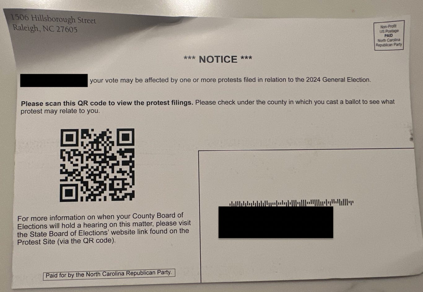 There is nothing particularly unusual about requesting recounts in close elections. But Griffin is also taking a page out of President-elect Donald Trump's playbook and claiming that tens of thousands of votes were cast illegally. Griffin's campaign sent postcards to the voters whose ballots it is seeking to invalidate, alerting them of the protest. Popular Information obtained a photo of one of the postcards: