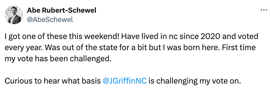 Many eligible North Carolina voters have been caught in Griffin's dragnet and had their votes questioned. One was Anna Richards, an elected member of the Orange County Board of County Commissioners in North Carolina. Richards shared her story on X: