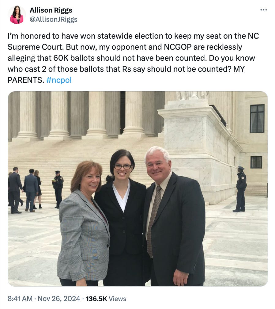 In an effort to overturn the results of November's election, Jefferson Griffin, a Republican candidate for the North Carolina Supreme Court, is asking state election officials to throw out more than 60,000 ballots. Among the voters being targeted by Griffin's protest are the parents of his Democratic opponent, Allison Riggs.