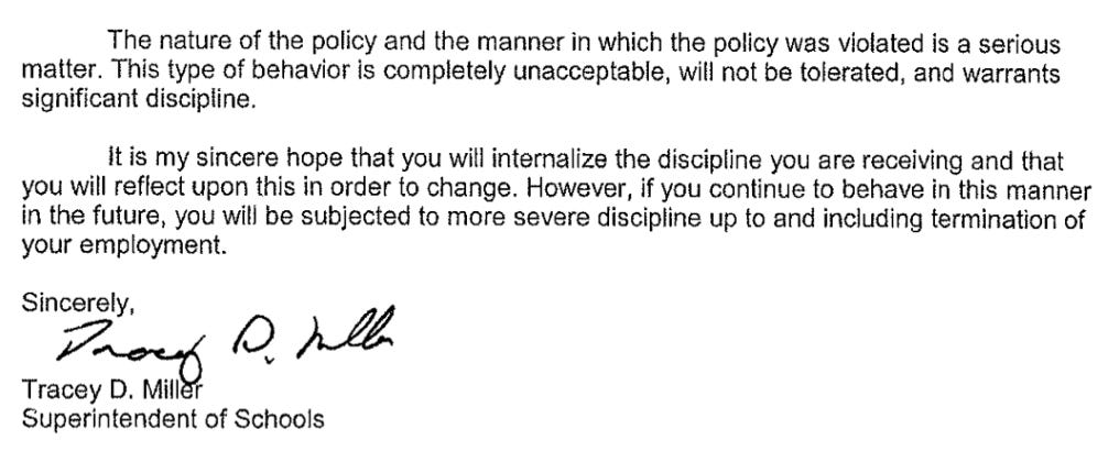 On November 6, Miller sent Cahall a letter informing Cahall that she was suspended for three days without pay. Miller accused Cahall of "intentional and serious violation of Board policy and procedure" by placing books in her "classroom library that contained themes and discussion of topics of a controversial nature." Miller said that Cahall should have known that including the books in her classroom library was unacceptable because "based on your experience in this community you understand the values that many hold." Miller said Cahall's behavior was "completely unacceptable, will not be tolerated and warrants significant discipline." Miller said that if Cahall continues "to behave in this manner in the future" she may be terminated.