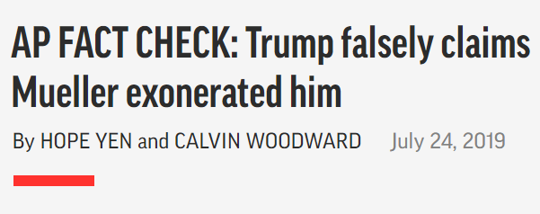 This precise claim was evaluated by the Associated Press, which is an official Facebook fact-checking partner. "President Donald Trump falsely claimed exoneration from Robert Mueller on Wednesday even as the former special counsel told Congress he offered no such vindication," the AP reported.