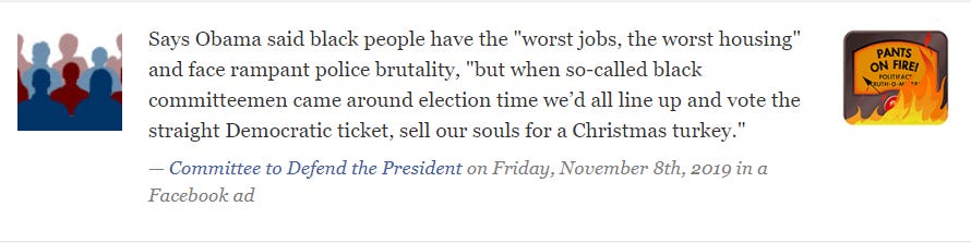 When the same Obama quote was used in a 2017 House race, Facebook fact-checking partner Politifact rated it "Pants on Fire." Popular Information alerted Politifact that The Committee to Defend the President was using the same tactic again. Politifact evaluated this Facebook ad and rated it "Pants on Fire" again.