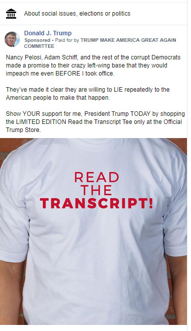 The shirt being sold in this advertisement, incidentally, is also false. No one can read the "transcript" of Trump's call with the Ukranian president because a transcript was not released. The White House released a "call summary" of the conversation, which is not a complete transcript. As Politifact, another Facebook fact-checking partner, notes, the document released by the White House says it "is not a verbatim transcript of a discussion."(It is, nevertheless, damning.)