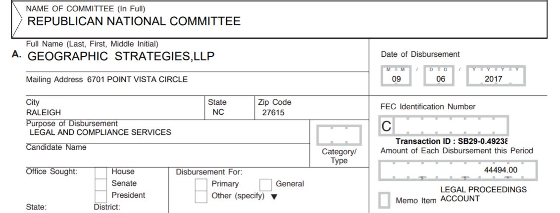 Starting in August 2011, the RNC began making payments to Hofeller's firm, Geographic Strategies LLP, for "legal and compliance" service. The RNC paid Hofeller $44,000 on September 6, 2017. That payment came just a week after Hofeller ghostwrote the DOJ letter that used the pretext of the Voting Rights Act to justify the citizenship question.
