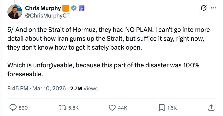 Senator Chris Murphy (D-CT) relayed a similar message on March 10 after receiving a classified briefing. According to Murphy, the administration had “NO PLAN” on the Strait of Hormuz and “don’t know how to get it safely back open.”