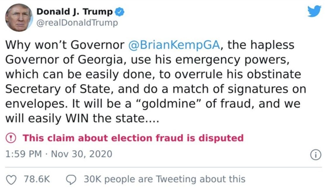 On Twitter, Trump publicly called on the Governor of Georgia to use his "emergency" powers to reverse the outcome of the presidential vote in that state.