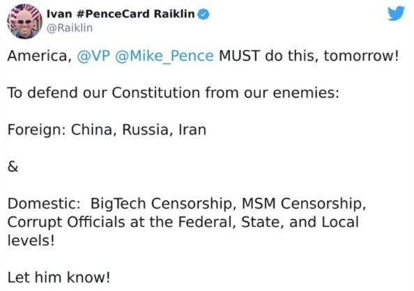 On December 22, 2020, Trump promoted a tweet in his feed encouraging Pence to reject the electors certified by the Electoral College in order to defend the country from "China, Russia, Iran."