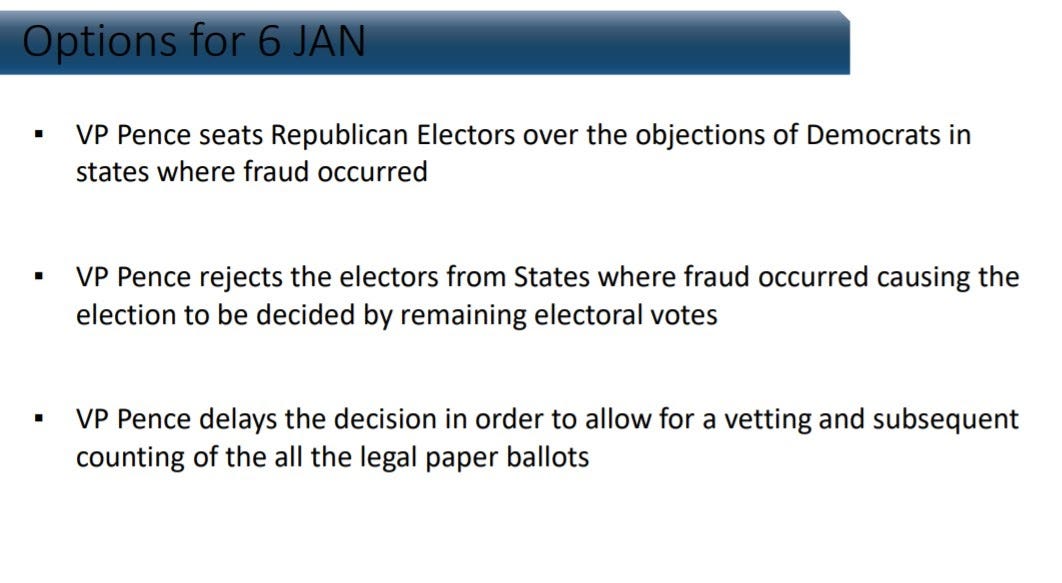 All three options involve Pence refusing to count or recognize some or all of the electors presented to him. That, of course, was precisely what Trump publicly called on Pence to do. On January 6, Trump spent much of his speech browbeating Pence to take action: