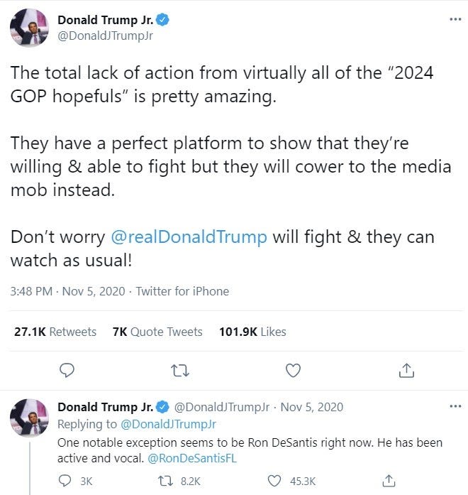 Donald Trump Jr. singled out DeSantis as one of the few leading Republican politicians willing to parrot his father's lies about election fraud.