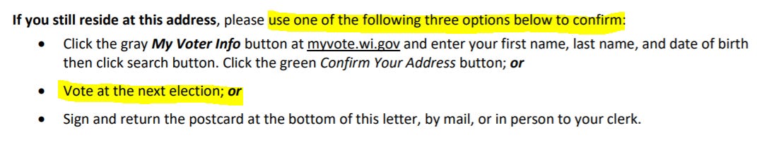 So Wisconsinites are being told they can safely ignore the letter and confirm their registration by voting in the next election. Now a judge has ruled that anyone not responding to the letter will be purged from the rolls immediately.