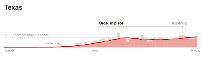 Texas allowed its "stay-at-home order to lapse on April 30, a move that gave Texas, the nation’s second-largest state, one of the shortest such orders in the country." The decision was not a result of any reduction in the pace of new cases in the state.