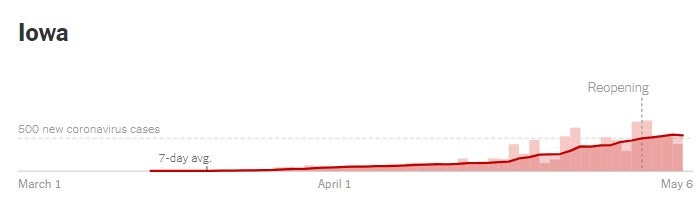 In Iowa, Governor Kim Reynolds (R) "loosened restrictions in 77 counties starting May 1." The move came even as cases statewide continued to increase.
