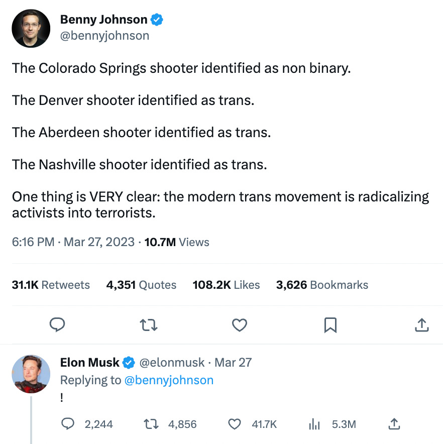 Benny Johnson, a right-wing provocateur and admitted plagiarist with 1.4 million followers on Twitter, said the Nashville shooting was proof that "the modern trans movement is radicalizing activists into terrorists." His commentary received a boost from Elon Musk, who owns Twitter and has 132 million followers.