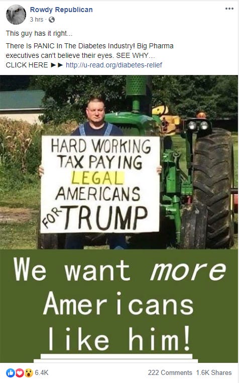 A large Facebook page, Rowdy Republican, has been using incendiary right-wing memes to push dangerous misinformation about diabetes to millions of Facebook users. Nearly three months after the page's tactics were exposed by Popular Information, Facebook has finally taken down the Rowdy Republican page, and a related page called A Conservative Nation.