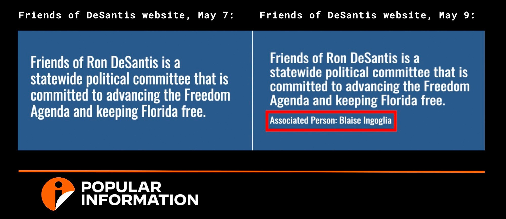 On Tuesday, the Friends of Ron DeSantis website was updated to list Florida State Senator Blaise Ingoglia (R), one of DeSantis' closest political allies, as the "Associated Person."