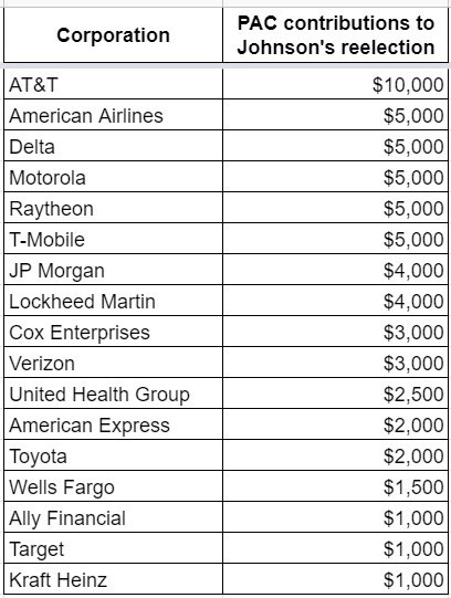 But despite Johnson's reckless actions that could needlessly extend a pandemic that has already killed more than 575,000 Americans, his reelection campaign continues to enjoy the support of major corporations.