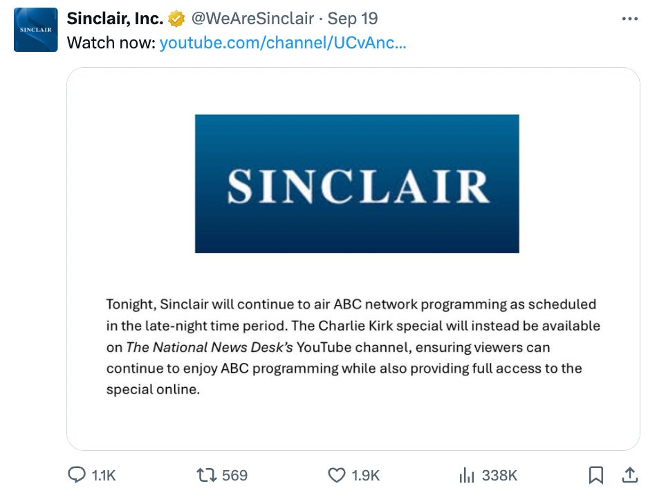 Sinclair announced that the Charlie Kirk special would air on its ABC affiliates "during Jimmy Kimmel Live’s timeslot" and "across all Sinclair stations this weekend." Further, "Sinclair is offering the special to all ABC affiliates across the country."