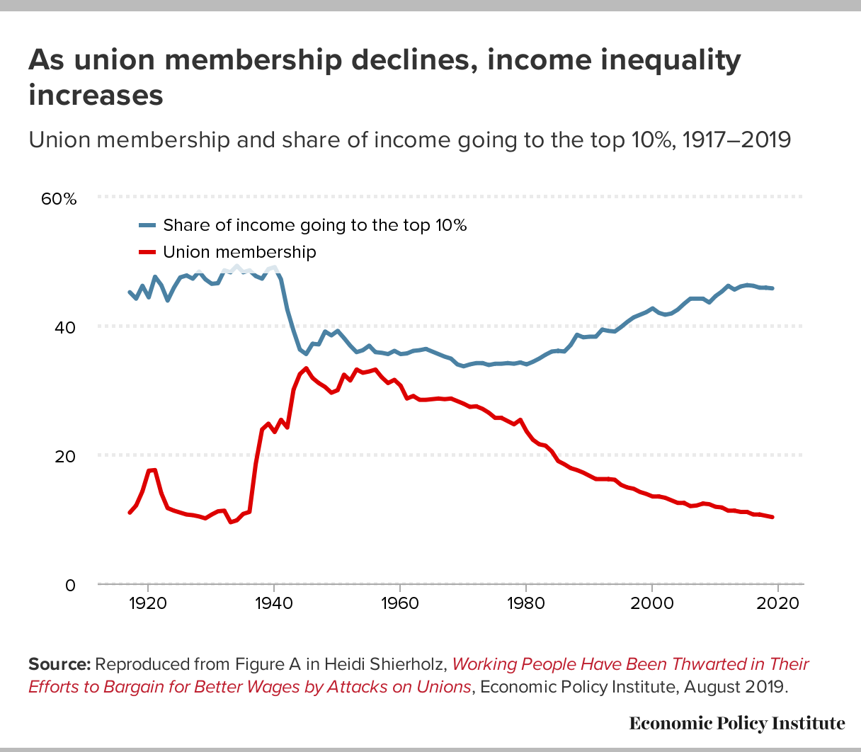 Research also shows that these trends were fueled by the decline of unionization. In the 50s, about one-third of the workforce was unionized. Today, it's only 10%. “The erosion of collective bargaining is the second largest factor that suppressed wage growth and fueled wage inequality over the last four decades,” the Economic Policy Institute reports.