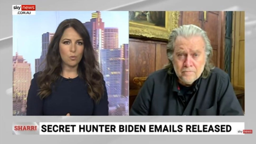 Bannon's interview concerns a series of articles published by the New York Post that allegedly disclose emails and other materials from Hunter Biden's laptop. Rudy Guiliani, Trump's lawyer, says he obtained the hard drive from a computer repair shop in Delaware. The repair shop owner claims Hunter Biden dropped off the laptop and never retrieved it. Both Sky News Australia and the New York Post are owned by Rupert Murdoch, the right-wing media mogul.