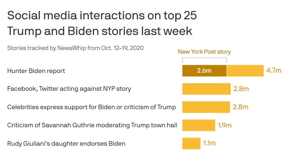 The Trump campaign and its supporters have spent the last week complaining that the New York Post stories have been "censored" by social media companies. The evidence doesn't support them. Axios reports that the New York Post story on Hunter Biden's emails was "the top story about the election" on Facebook and Twitter. Hunter Biden's emails and the related coverage were also the biggest topic on Facebook and Twitter last week. The second biggest topic on Facebook and Twitter last week, ironically, was Facebook and Twitter censoring the New York Post story.