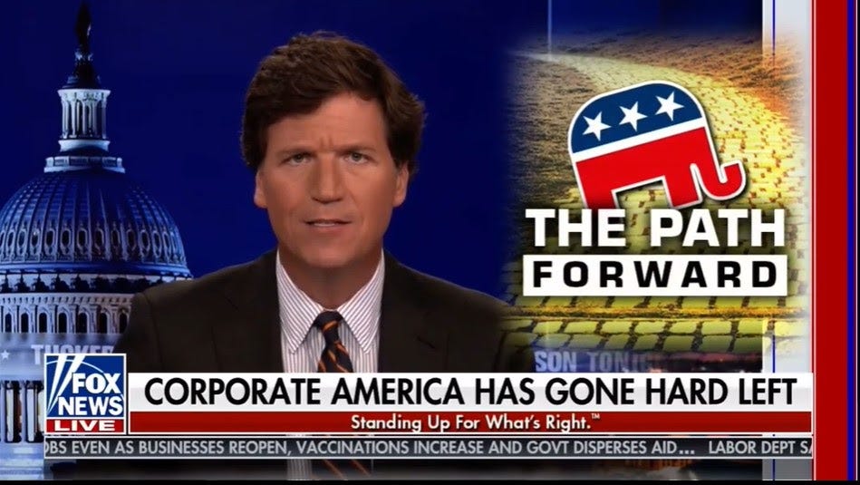 A website set up by Banks, Working Class GOP, highlights a Tucker Carlson segment where Carlson praises Banks for calling for the party to distance itself from corporate America.