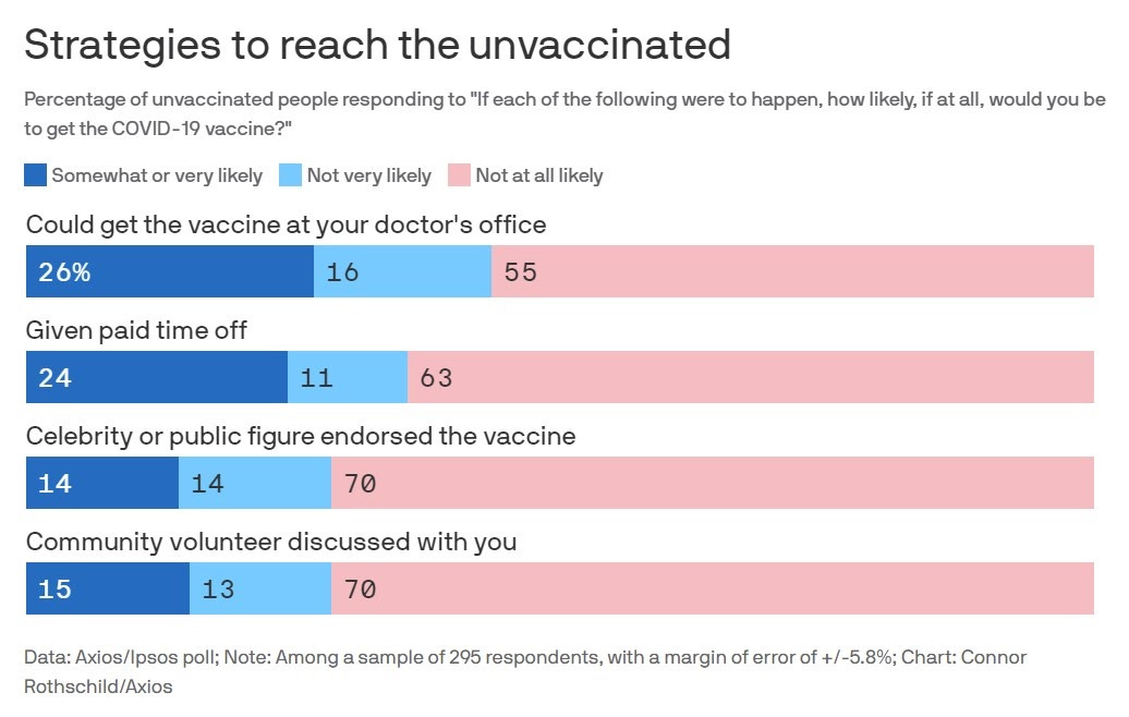 With the highly contagious Delta variant spreading rapidly in areas with low vaccination rates, there is renewed interest in convincing more people to get vaccinated. According to a new poll, a significant portion of the unvaccinated population (24%) could be convinced to get vaccinated if they received paid time off to receive the vaccine. Giving workers paid time off is much more effective than other tactics including celebrity endorsements or community outreach.