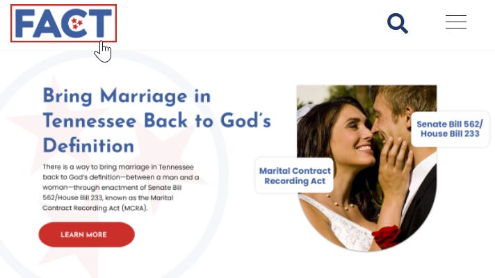 Tennessee Republicans are proposing an "alternative" form of marriage in Tennessee called a "Record of Marital Contract at Common Law." What was wrong with the existing form of marriage in Tennessee? Some people are upset that it is also available to same-sex couples. The new kind of marriage contemplated by the legislation would only be available to marriages between a man and woman.