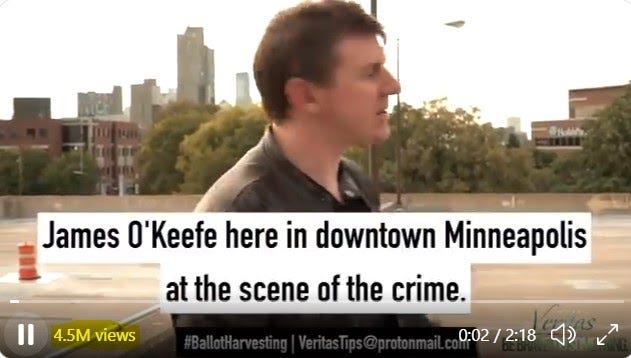 The Project Veritas video leads with this allegation, describing it as "illegal ballot harvesting." In the video, O'Keefe cites a Minnesota statute that says you can only help three people return your absentee ballot.