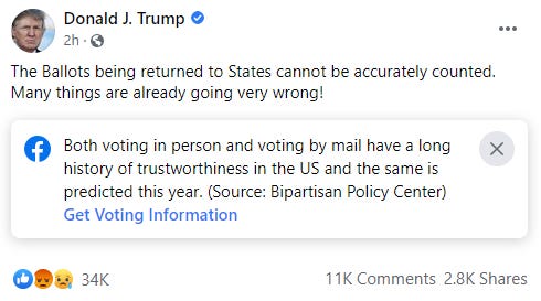 The new label makes clear that Facebook understands Trump is posting misinformation about whether votes are counted. But it is not fulfilling its stated policy to remove the post. Popular Information contacted Facebook about why it isn't enforcing its October 2019 policy but has not yet received a response.