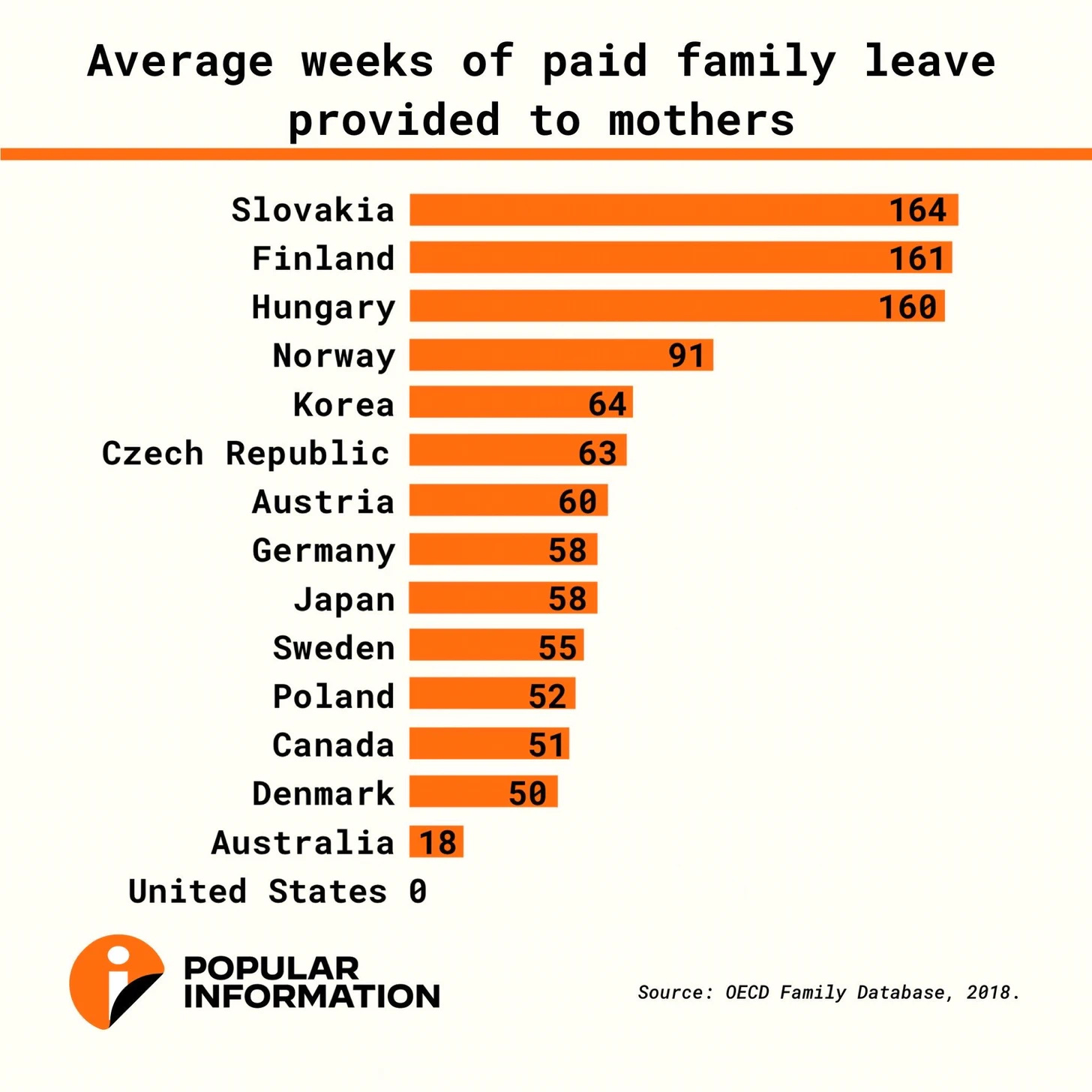 Moreover, many mothers are unable to breastfeed because America is the only developed country that has no guaranteed paid family leave. In 2018, the average guaranteed paid maternity leave benefit among the 38 OECD countries, a group that includes the European Union, Japan, and Australia, was 51 weeks.