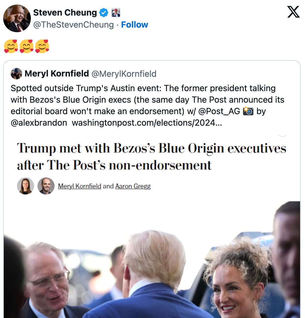 Hours after Lewis published the announcement, Trump was seen meeting with Blue Origin CEO David Limp. Steven Cheung, the Trump campaign's chief spokesman, embraced the suggestion that the meeting and the announcement of the non-endorsement were linked.