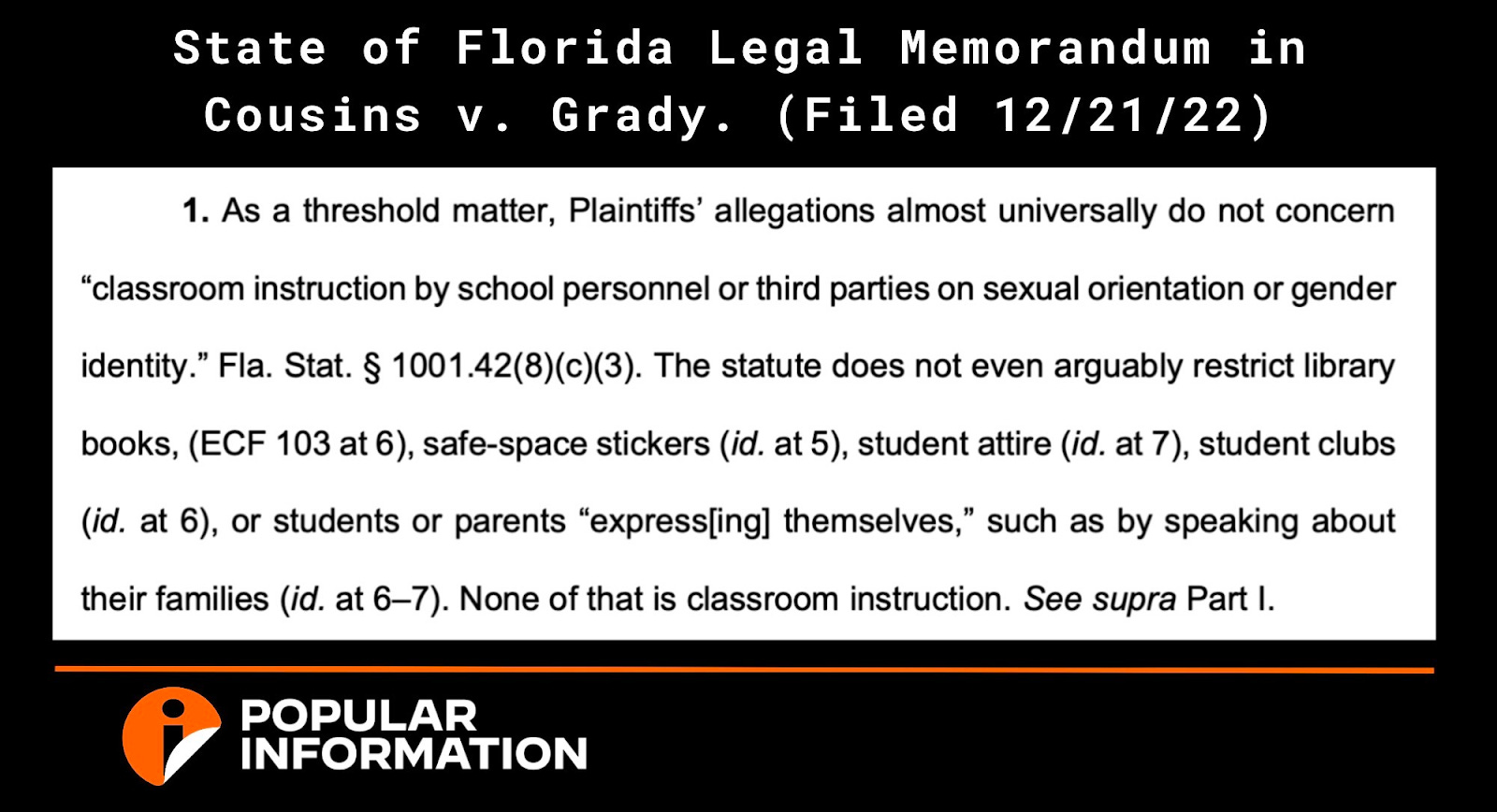 Kornegay states that, on June 21, 2023, she received guidance from the Florida Department of Education that the "age restriction on sexual orientation and gender identity does not apply to library books." The guidance included a legal memorandum filed in a separate case challenging the "Don't Say Gay" law in which attorneys representing Florida state the law "does not even arguably restrict library books."