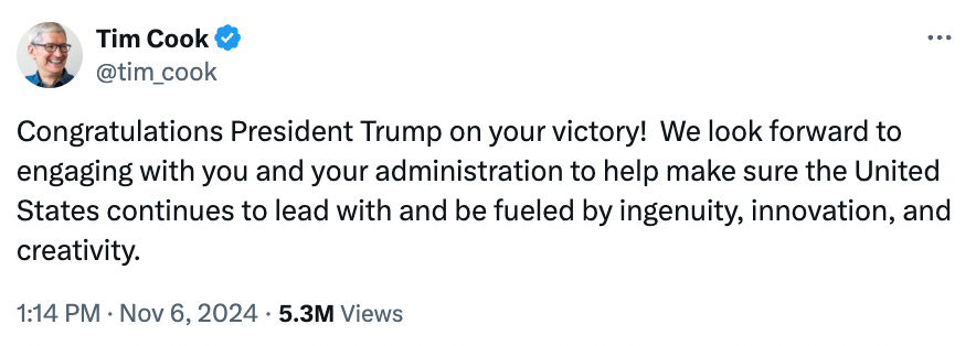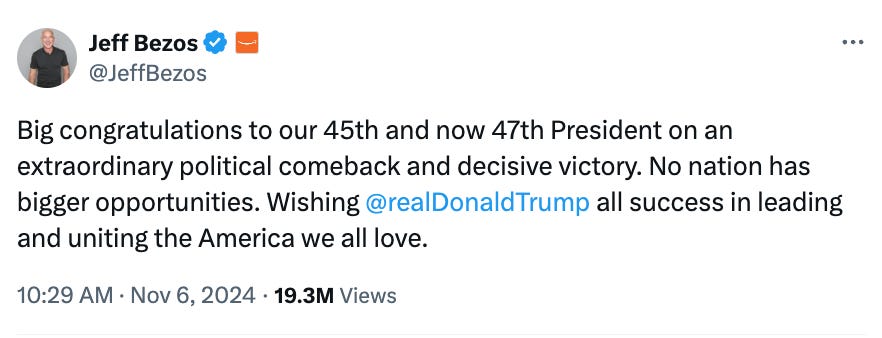 But after Trump won, Bezos did not hesitate to post an effusive congratulatory note on X, publicly praising Trump for "an extraordinary political comeback and decisive victory."