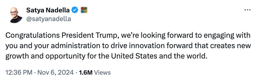 After Trump's victory last week, however, Nadella publicly congratulated Trump, suggesting Trump could create "new growth and opportunity for the United States and the world."