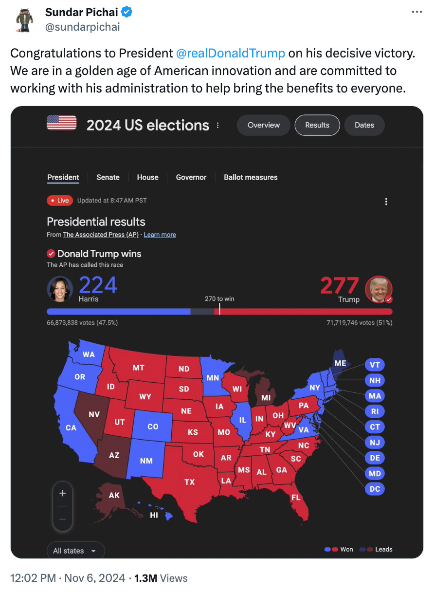 Less than four years later, Pichai has gotten over his shock and congratulated Trump on a "decisive" victory, including an image of an electoral college map. Pichai suggested that Trump's victory would usher in a "golden age of American innovation" that would "bring benefits to everyone."