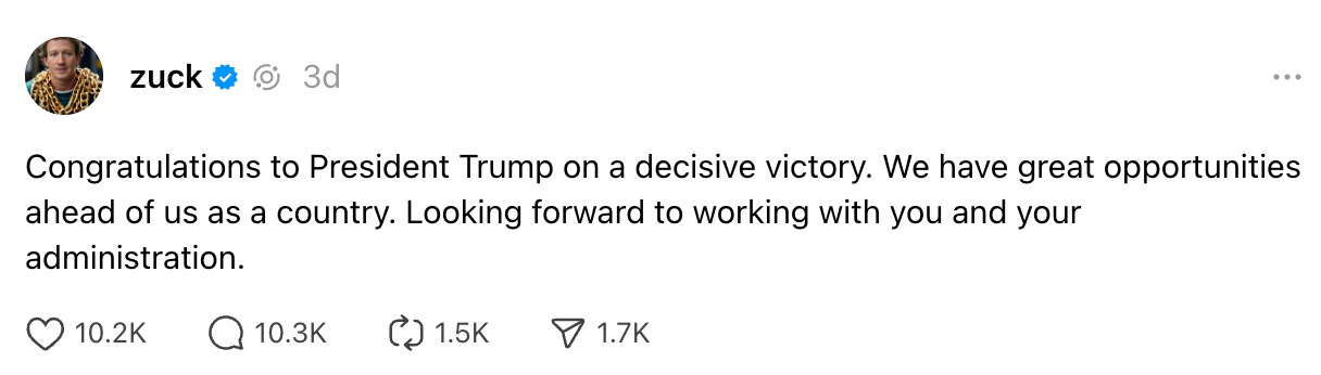 Does Zuckerberg send this kind of congratulatory message after every election? No. Popular Information found that Zuckerberg offered no congratulatory message at all to Biden after his 2020 victory.