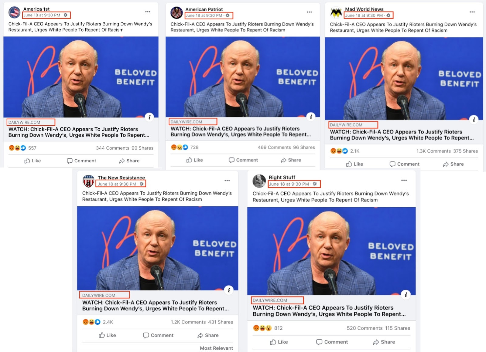 For example, all five pages shared this article from The Daily Wire on Aunt Jemima at 7:30 PM on June 19, 2020.